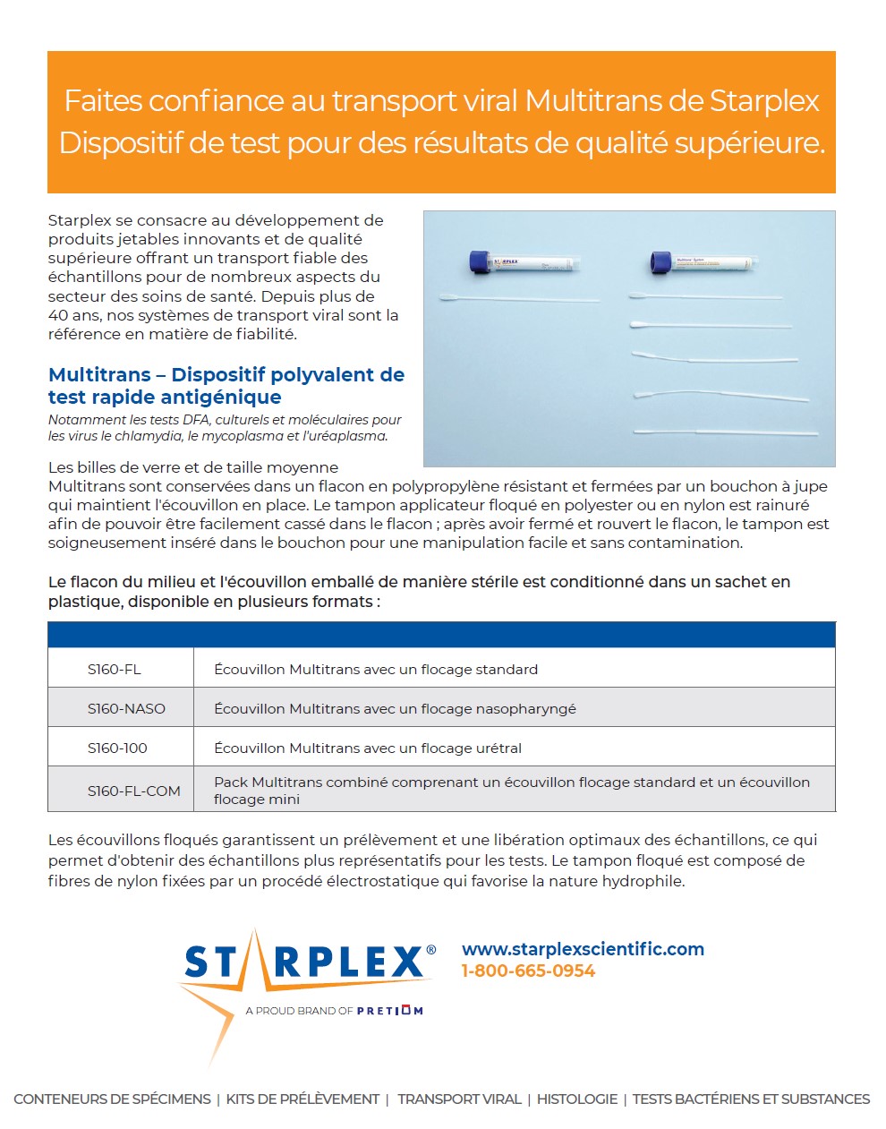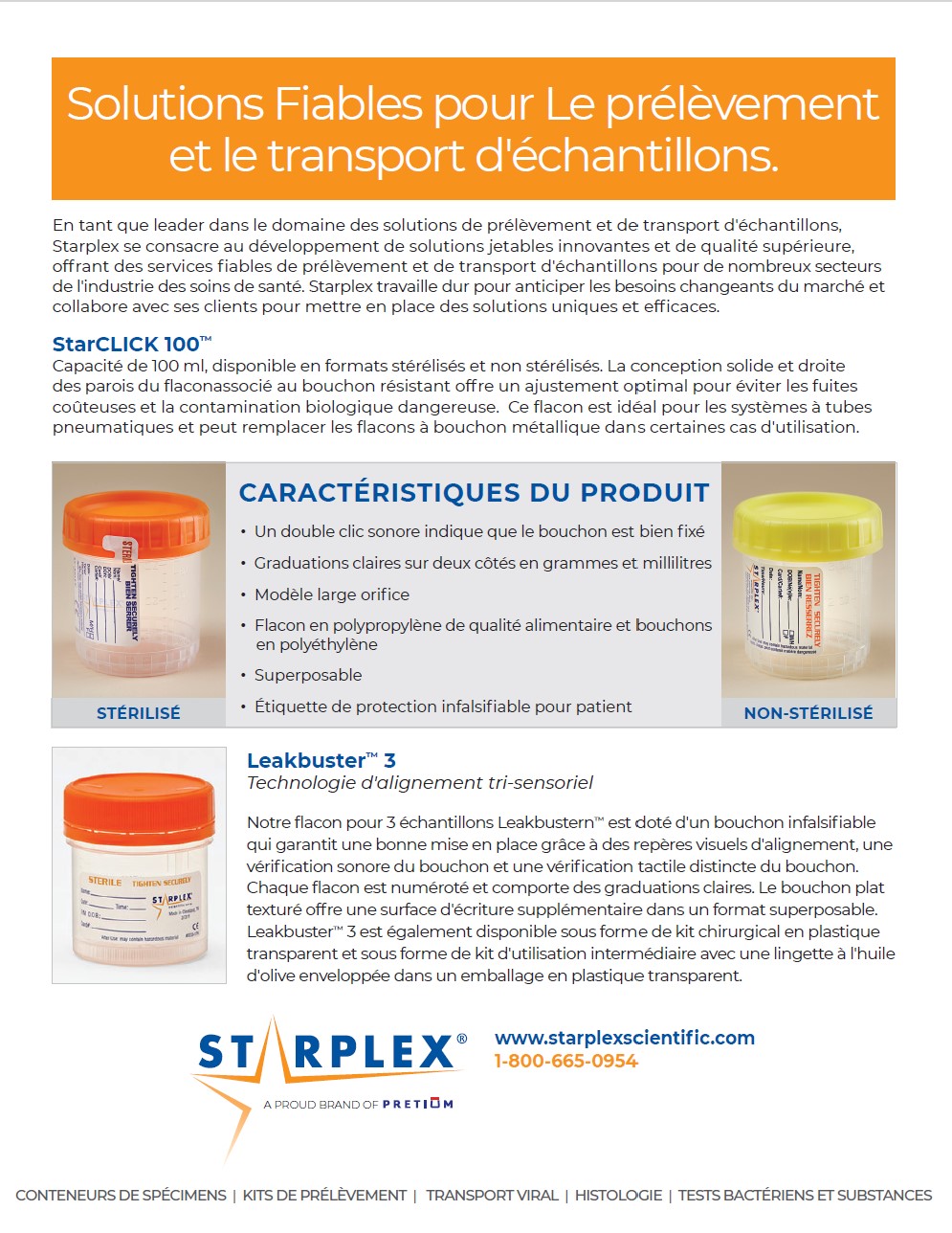 PRODUCT GUIDES & FLYERS Download our convenient product guides and sales flyers to see the full range of Starplex products. Starplex Product Guide (English) Starplex Product Guide (French) Starplex Product Codes & Descriptions (English) Starplex Product Codes & Descriptions (French) Specimen Collection & Transport (English) Testing Vials & Containers (English) Starplex Swabs & Media (English) Starplex Multitrans Viral Transport (English) Histoplex Histology Systems (English) 30ml Collector Vials (English) Starplex Pharma Cylinders (English) Starplex Through Bead Packers (English) Starplex Pharma Packers (English) Specimen Collection & Transport (French) Starplex Swabs & Media (French) Testing Vials and Containers (French) Histoplex Histology Systems (French) Starplex Through Bead Packers (French) 30ml Collector Vials (French) Starplex Pharma Packers (French) Starplex Multitrans Viral Transport (French) Starplex Pharma Cylinders (French)